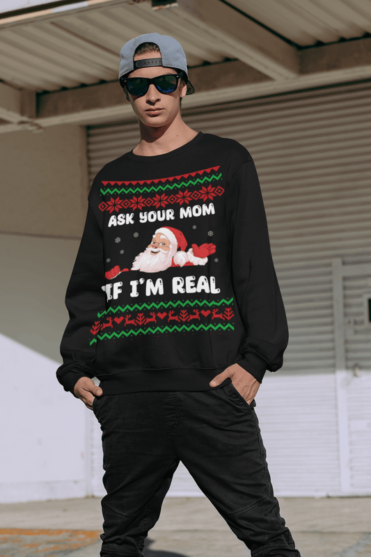 Ask Your Mom If I'm Real Santa Crewneck Pullover Sweatshirt | Ugly Christma Sweater